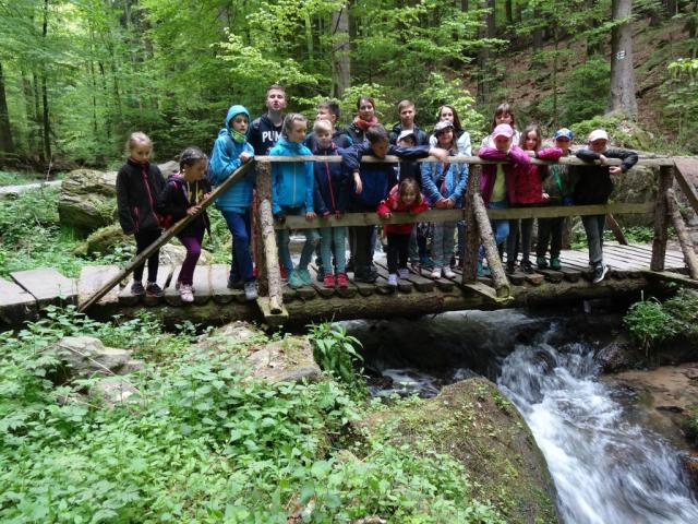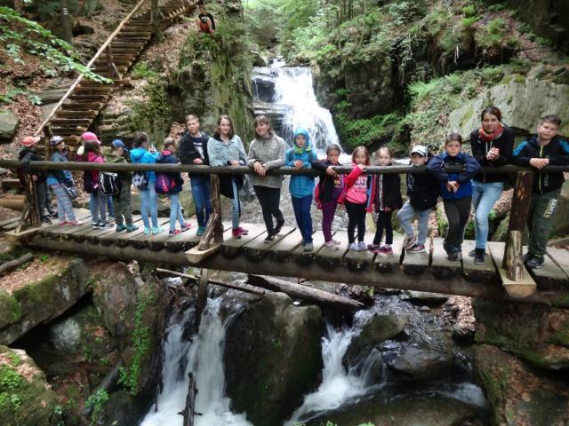 Páteční večer jsme strávili venku - hraním her a opékáním špekáčků. Sobota byla ve znamení celodenního výletu, hlavním cílem trasy dlouhé cca 16 km byly Rešovské vodopády. Ty zde vytvořila říčka Huntava, ve skalnatém údolí jsme mohli vidět několik kaskád a vodopádů. Pro návštěvu této lokality je právě jaro vhodným obdobím. V časném odpoledni jsme se zastavili v Penzionu nad vodopády v Rešově a zkusili se zeptat na možnost podání 20 obědů bez předchozí rezervace. Nebyl problém, obsluha milá a příjemná, stále se to dnes běžně nevidí! I na zpáteční cestě jsme obdivovali malebnou přírodu Jeseníků, horské louky s koňmi a ovcemi apod.