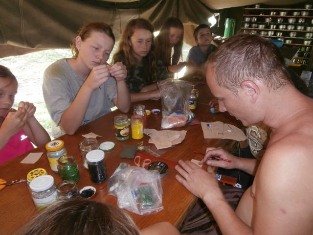 Přijeli jsme a ubytovávali se v dešti a pak celý den jsme vychytávali dešťové pauzy, abychom uskutečnili zahajovací rituály a také se s plným nasazením vrhli do přípravy na život indiánů prérie u Černých skal... A když se dobře připravíte a Velký Kawa vyslyší prosby Tuláčat, pak „kouzelná noc“ (což je ta první táborová) vyjde a my opět můžeme prožívat nový příběh Tébiů, už asi dvacátý nebo dvacátýprvý, kdo to ví ? Letošní příběh patří SVĚTLU…