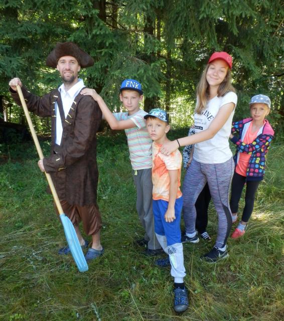 Měli jsme tedy všech 9 tolarů, ale něco jako by nám ještě scházelo. Ano, poklad! Při hledání jsme se proběhli po celém areálu a jeho blízkém okolí a na základě přichystaných otázek jsme si připomněli průběh a hry celého tábora. Když se zelená posádka jako první dostala k poslednímu lístečku s nápovědou, rozběhla se vyzvednout si svůj poklad. Postupně se přidaly další posádky, a když pak všichni otevírali pytle s pokladem, měli velikou radost z krásných oranžových, zelených nebo hnědých triček. Zbytek pokladu byl v podobě sešitů, lízátek, propisek a podobných upomínkových předmětů. Večer jsme letošní úspěch oslavili pirátskou taneční slavností a slavnostním vyhlášením. Skóre mezi mnohými týmy bylo hodně vyrovnané, ale nakonec se na prvních místech umístily posádky "Archa B&L" (velcí) a "Mořské krysy" (malí).