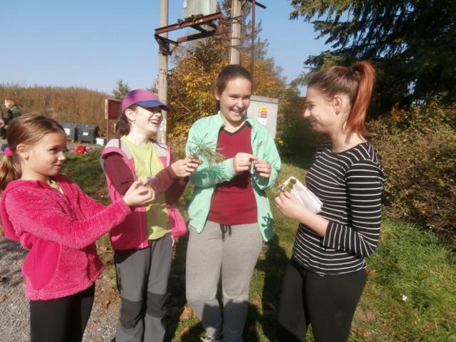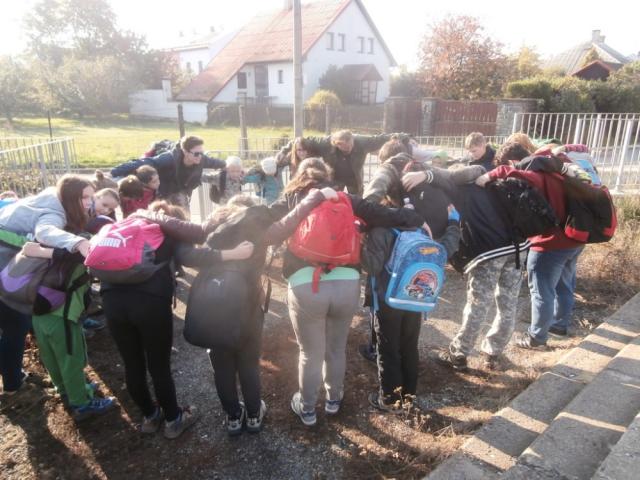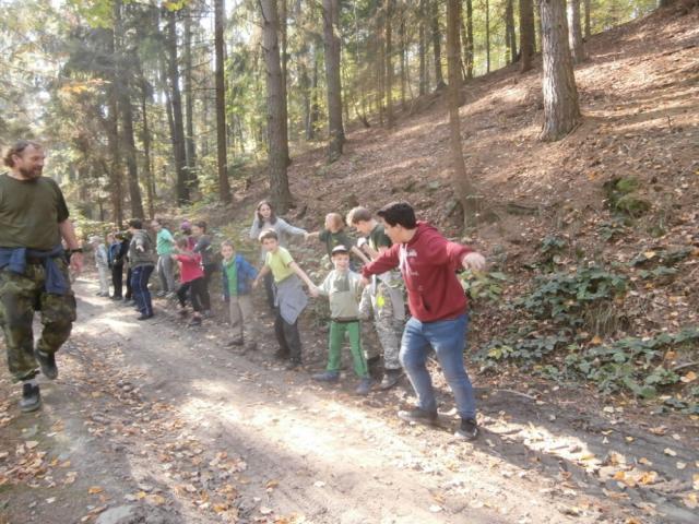 Je sobota 13. října a my máme plánovanou výpravu, tentokrát vyrážíme vláčkem. Ale jedeme jenom chvilku, skoro ani paní "Štíplístková" (průvodčí) nestihla štípnout naše lístky a už vystupujeme. Malé nádražíčko. No, ani to nádraží není, jen nějaká autobusová budka. Ještěže je tu cedule, protože ti, co nestihli předem kouknout na naše webové stránky, tak ti by ani nevěděli, kdepak to jsme.