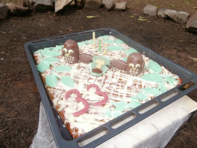 Brouček přivezla nádherný dort, který sama upekla a za pomoci maminky a nováčka Daníka také nazdobila. Byl tak krásný, že nám ho bylo až líto sníst, hlavně ty marcipánové sovy (máme totiž dva rody – Sovy a Sovičky). Ale mlsné jazýčky nakonec vyhrály, mňam. A pak následovala tradiční hra Rezervace, která také patří k našim narozeninám. Ona totiž v lesíku u našeho tábořiště v Laškově žije velká spousta zvířat, dokonce i medvědi! Takže se tu nachází rezervace „Tulakos“ a září je jediný měsíc, kdy je povolen odlov této zvěře, aby se tu nepřemnožila. Samozřejmě se loví živá zvířata a prodávají se v místním Zverimexu. Odchycená zvířátka opravdu nejdou na pekáč, ale do jiné rezervace, kde jich je zas málo, takže máme čisté svědomí. I tak ale musíme mít „povolenky“, ty si kupujeme u správce rezervace a hned na začátku hry se tak zadlužíme v místní bance, protože je to drahá záležitost. Také si musíme dávat bacha na pytláky, ti jsou bohužel ozbrojeni papkoulemi a když vás zasáhnou, o vše přijdete a ještě se jdete na pět minut léčit do Hospitalu, kde za ošetření samozřejmě platíte. A když moc šetříte, povolenku si nekoupíte a chytí vás strážce rezervace, jdete do vězení a ještě zaplatíte pokutu. Prostě, pořád za něco draze platíte (jak se zlobil Rayen). Samozřejmě je tu velkorysá banka, ta vám půjčí kolik chcete, ale musíte lovit jako diví, ať ty dluhy splatíte. No, co vám budu povídat. Byla to pěkná dřina. A z tábořiště, kde sídlí všechny ty instituce – banka, vězení, správce, nemocnice, obchod, tak odtud do lesa to bylo pěkně daleko. A i když se pytláci a strážci prý snažili, přesto letos zbohatlo docela dost Tuláků, výdělky některých šly až do tisíců! A to tu už dlouho nebylo. Až se mi to zdá dost podezřelé. Že by se pytláci a správci flákali? Nebo už možná nemají takovou fyzičku jako ti loňští, předloňští, předpředloňští… Nebo je ta dnešní generace lovců (dětí) šikovnější a dravější? Odpověď bohužel můžeme zjistit zase až za rok, protože tahle naše hra je opravdu jen „narozeninová“. Ostatním dužinám ji však doporučuji, je príma.
