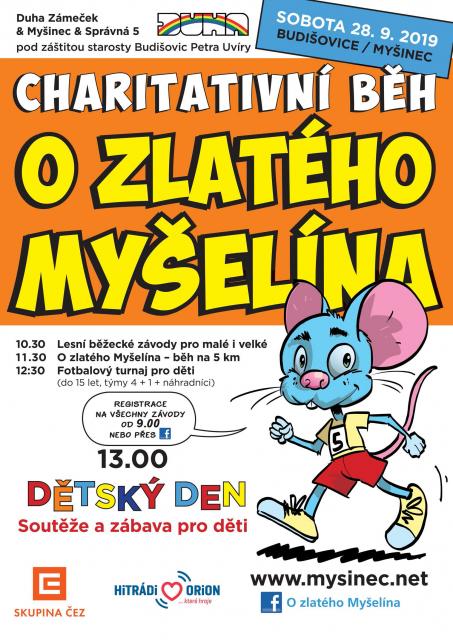 V sobotu 28. 9. 2019 se uskuteční druhý ročník charitativního běhu O zlatého Myšelína. Akce proběhne na TZ Duhy v Budišovicích, pořádájící dužinou je Duha Zámeček, pod záštitou starosty Budišovic Petra Uvíry. Trasa závodu měří 5 km. Součastí budou lesní běžecké závody pro malé i velké, fotbalový turnaj pro děti, dětský den se soutěžemi a zábavou pro děti.
