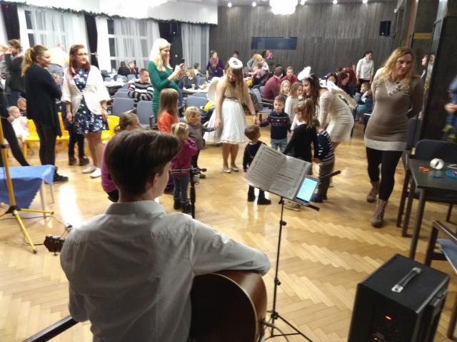 Po přivítání a úvodním slovu paní ředitelky Mgr. Ivany Čagánkové se děti pustily do tvoření vánočních stromečků a sněhuláků z vatových tamponů. Aby dětem šla práce lépe od ruky, tak je na kytaru doprovázel Vašek Bařinka, který hrál a zpíval nejen koledy, ale i taneční písničky.
