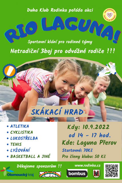 Další tradiční akcí Duha Klub Rodinka je sportovně zaměřená akce RIO LAGUNA, která se letos konala v sobotu 10. 9. 2022. Při registraci dostaly děti, jako každý správný sportovec, závodní čísla a kartičku na sbírání razítek za splnění úkolů na stanovištích. Pak už se mohly vydat na cestu, kde je čekaly rozličné sportovní disciplíny.