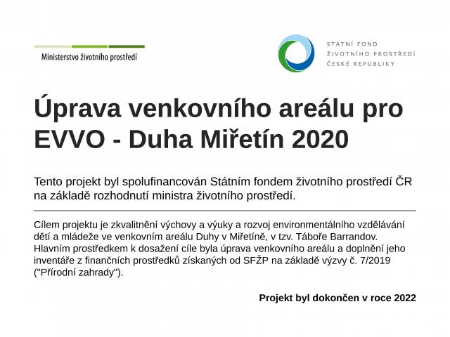 Hlavním prostředkem k dosažení cíle byla úprava venkovního areálu a doplnění jeho inventáře z finančních prostředků získaných od SFŽP na základě výzvy č. 7/2019 ("Přírodní zahrady"). Projekt „Úprava venkovního areálu pro EVVO - Duha Miřetín 2020“ byl spolufinancován Státním fondem životního prostředí ČR na základě rozhodnutí ministra životního prostředí. V rámci projektu se nám v Miřetíně podařilo instalovat 6 naučných panelů o okolní přírodě, které doplňují interaktivní prvky, pořídit rozličný materiál pro udržování areálu, postavit dřevěný přístřešek, dosít trávník, zasadit strom a několik keřů. Nazalizaci se podílelo několik pobočných spolků Duhy a místní veřejnost.