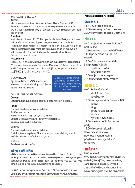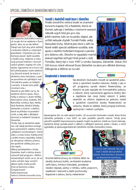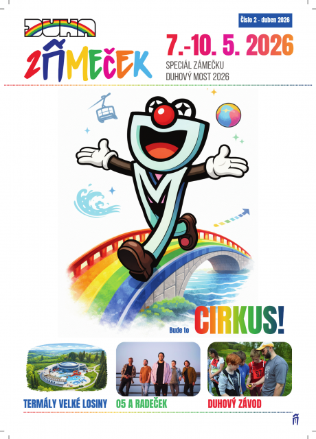 Duhový most se blíží! Proběhne od čtvrtku 7.5.2026 do neděle 10.5.2026 v Šumperku.Organizační tým pracuje na plné obrátky, aby to byl opravdu povedený cirkus. Vše se rýsuje do finální podoby a účastníci se můžou těšit na vše, co se chystá. Další informace ve druhém čísle Duhového zpravodaje.