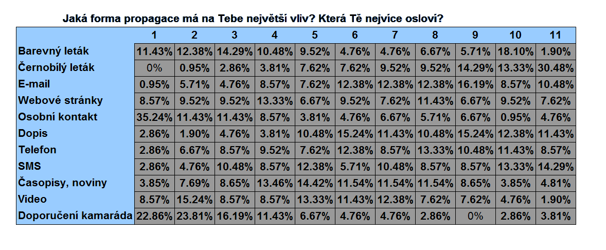 Z našeho průzkumu dále vyplývá, že i v době nesčetných forem komunikace je stále nejvíce preferovaná ta osobní. Velké přízni se však těší také mobilní telefon a nejnovější trend sociálních sítí v čele s Facebookem. Klasická pošta je oblíbená nejméně, na paty jí ale šlape kdysi dříve oblíbené ICQ.